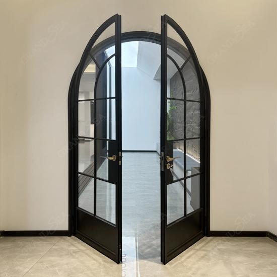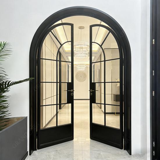 Portes-fenêtres cintrées de luxe en aluminium, cadre noir, double porte d'entrée en verre trempé, style français.