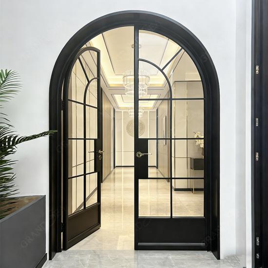 Ce haut de gamme double porte française cintrée Dotée d'un cadre en alliage d'aluminium noir et d'une grille vitrée, cette porte est également équipée d'un système de verrouillage haute sécurité, garantissant à la fois une protection anti-effraction et une isolation thermique performante. Fabriquée en aluminium extrudé 6063-T5 et revêtue d'une peinture en poudre hautement résistante aux intempéries, elle est non seulement exceptionnellement durable, mais aussi parfaitement adaptée aux villas, maisons individuelles et espaces intérieurs.